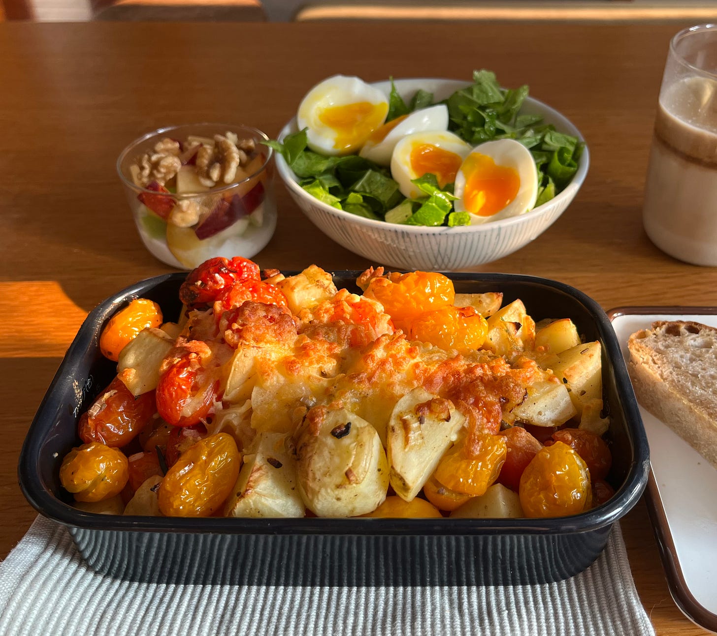 早餐用掉最後兩顆馬鈴薯,和最近很多的小番茄。今天比較早起,趁樓上開工前慢慢炒了蒜末和洋蔥,加入信行做的綜合香料,再和馬鈴薯和小番茄一起送進烤箱。生菜是自己陽台菜園拿的,超級的新鮮,滋味豐富。