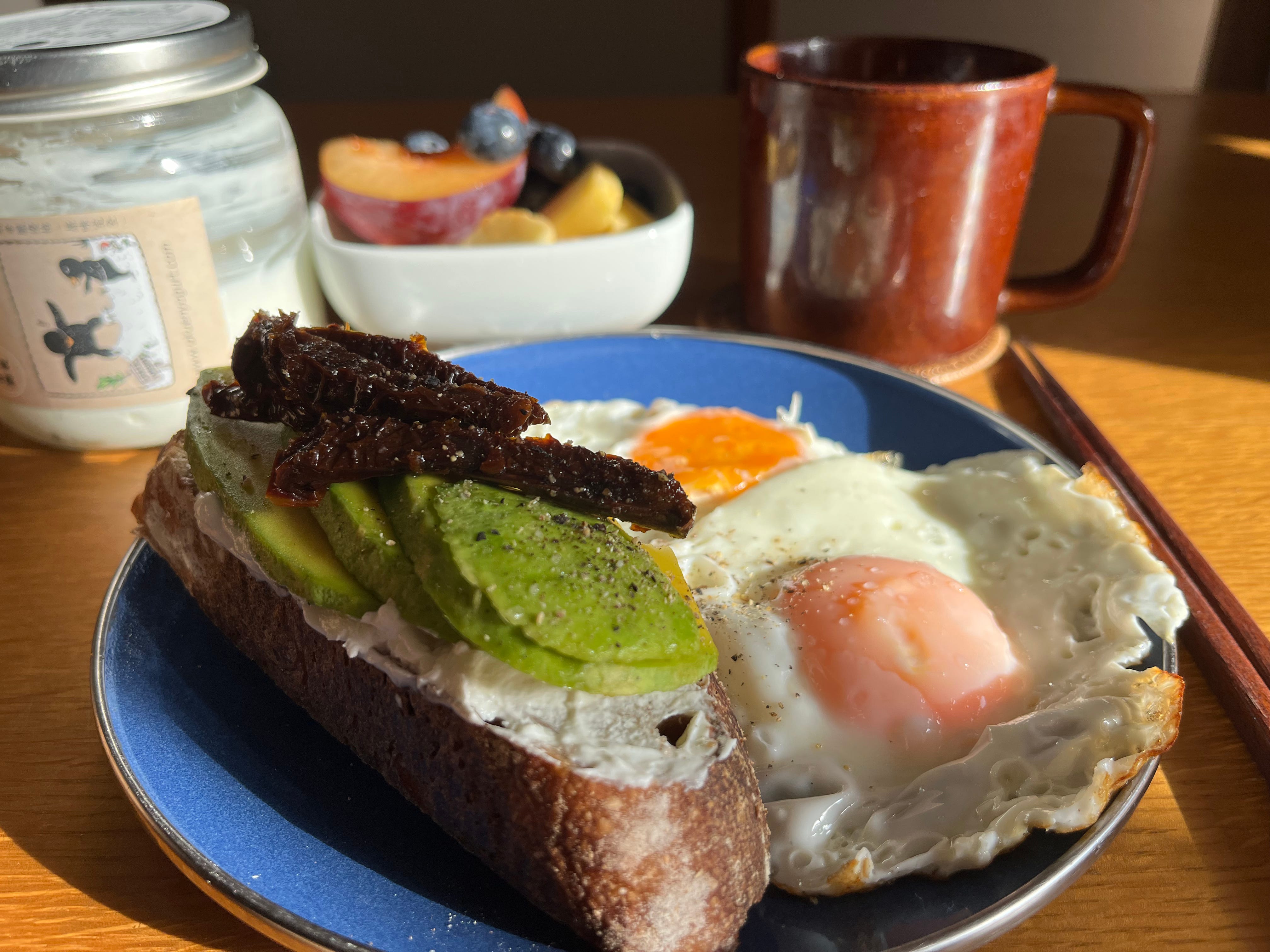 最近有自己做的酸種麵包,烤過之後抹上希臘優格。酪梨本來想壓爛,但台灣產的酪梨熟度好難掌控喔,壓不爛,只好切片。酪梨之後最重要的步驟:磨上胡椒與鹽。這樣就超美味了。油漬番茄隨意。
