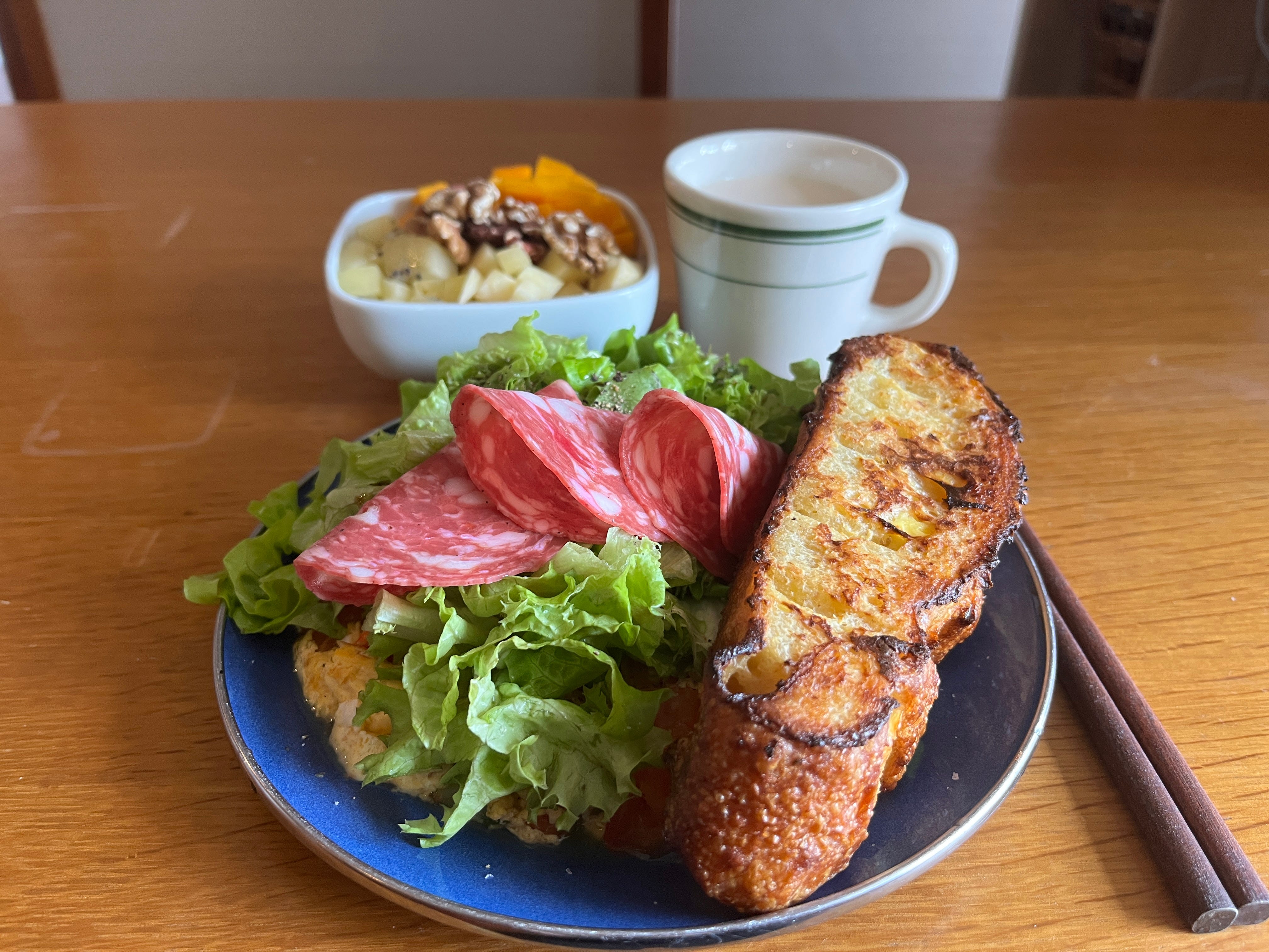 早餐是法式吐司,法式吐司是麵包更乾掉了的解方。把雞蛋、牛奶、和鹽打散,麵包泡進去吸飽吸軟,用奶油煎。而剩的蛋奶液我會把他加入全蛋做成烘蛋。