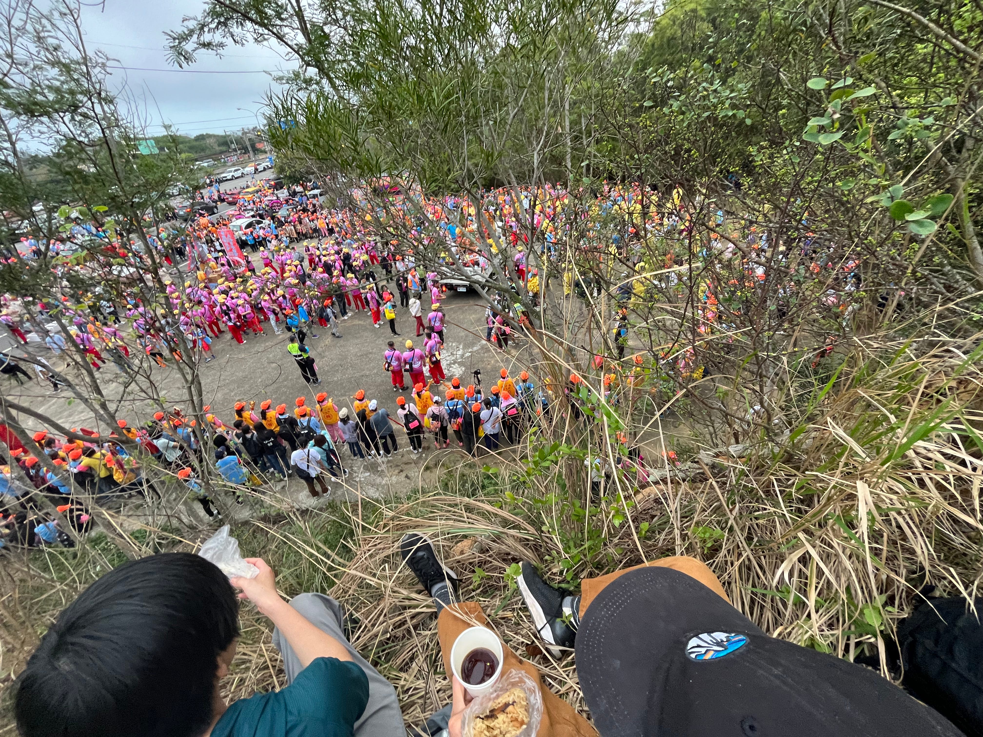 很厲害耶,碗粿、油飯、芋圓、蘿蔔魚丸湯、鹹湯圓、乾拌冬粉、冰咖啡、冰洛神、烤地瓜、酸菜肚片湯、炸花枝丸,每一樣都遞到你面前說「媽祖請的」,每一樣都非常好吃。晚上在白沙屯路邊紮營的時候,整條街都在大鍋大鍋的用豬骨或雞骨熬湯,準備隔天用。心想這裡的食物完全無雷,跟平常吃小吃的雷率也差太多了吧?是不是大家平常都當成上班隨便煮煮,媽祖來了不得不拿出真正的實力?