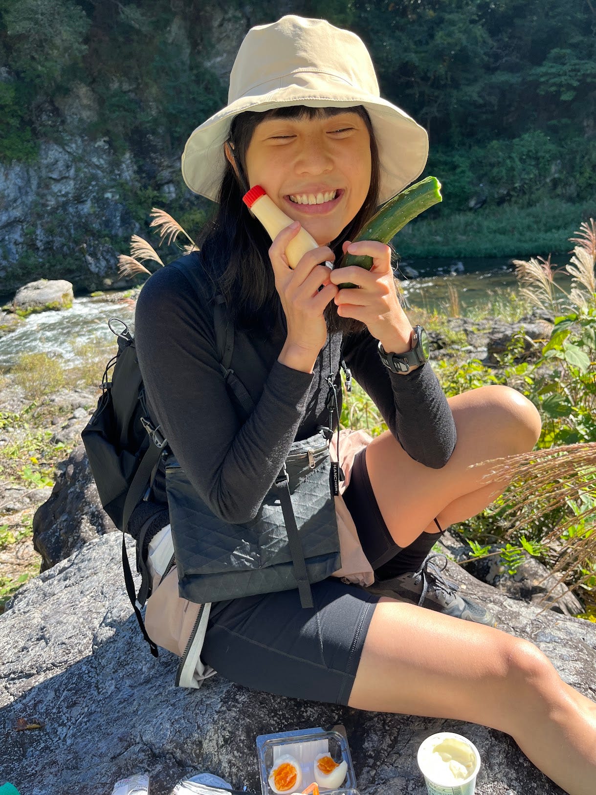 我們走下溪谷,陽光閃閃發亮,選了一塊位於制高點的大石頭,像看電視一樣的欣賞一組攀岩者。今天早餐吃黑麵包,抹上小農場自產的白乳酪,水煮蛋擠上kewpie美乃滋,小黃瓜也要配kewpie。看著下方的攀岩人們,輪流嘗試,一步一步的慢慢解題。就這樣一起共享美麗的多摩川。