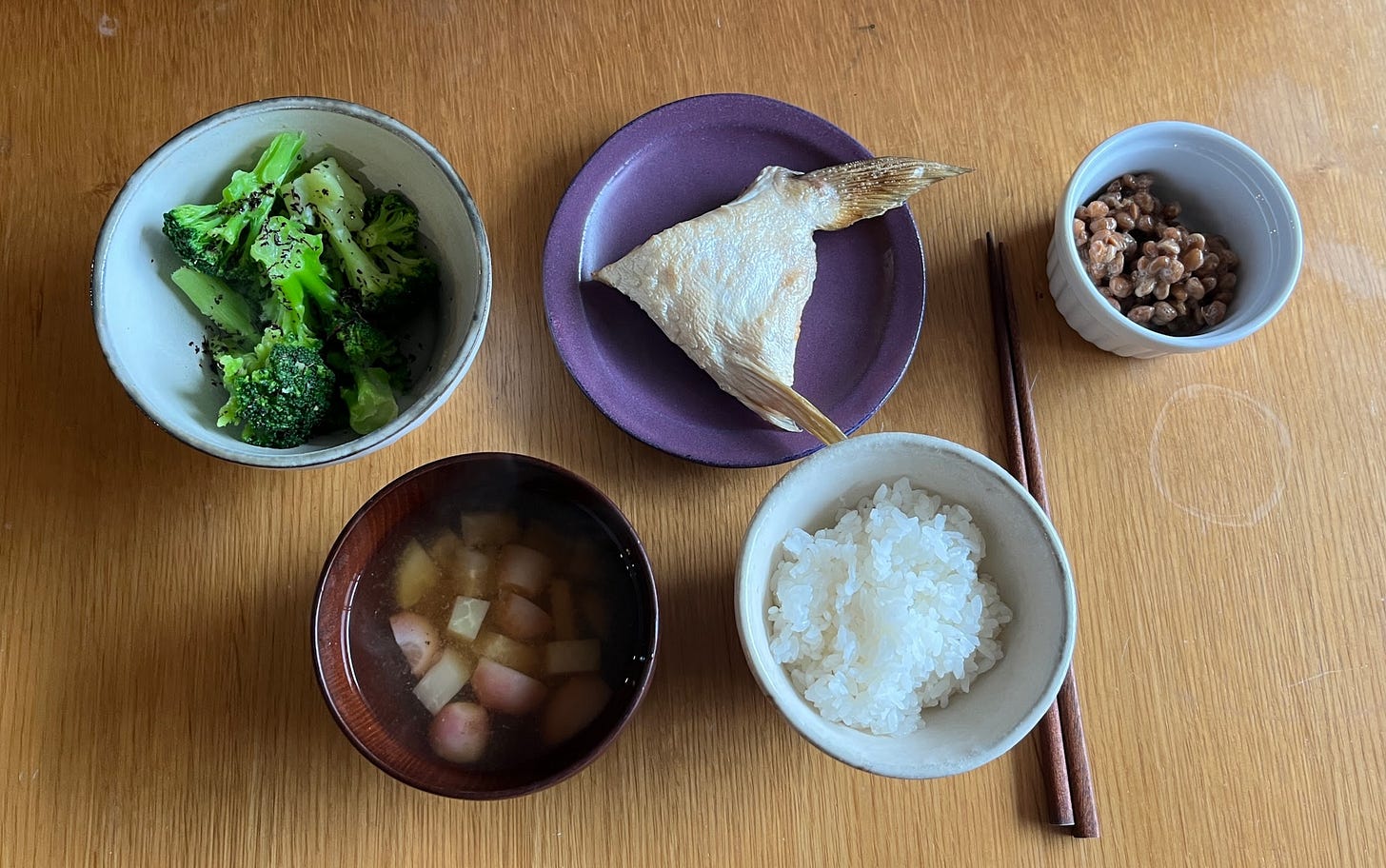 總之如果要攝取高品質蛋白質的早餐,日式早餐是最棒的了。有烤魚、納豆、味噌湯、和米飯。味噌湯裡還有鄭克微採的櫻桃蘿蔔。這樣的早餐,多吃一點,應該很快就可以恢復健康、開始跑步了吧。
