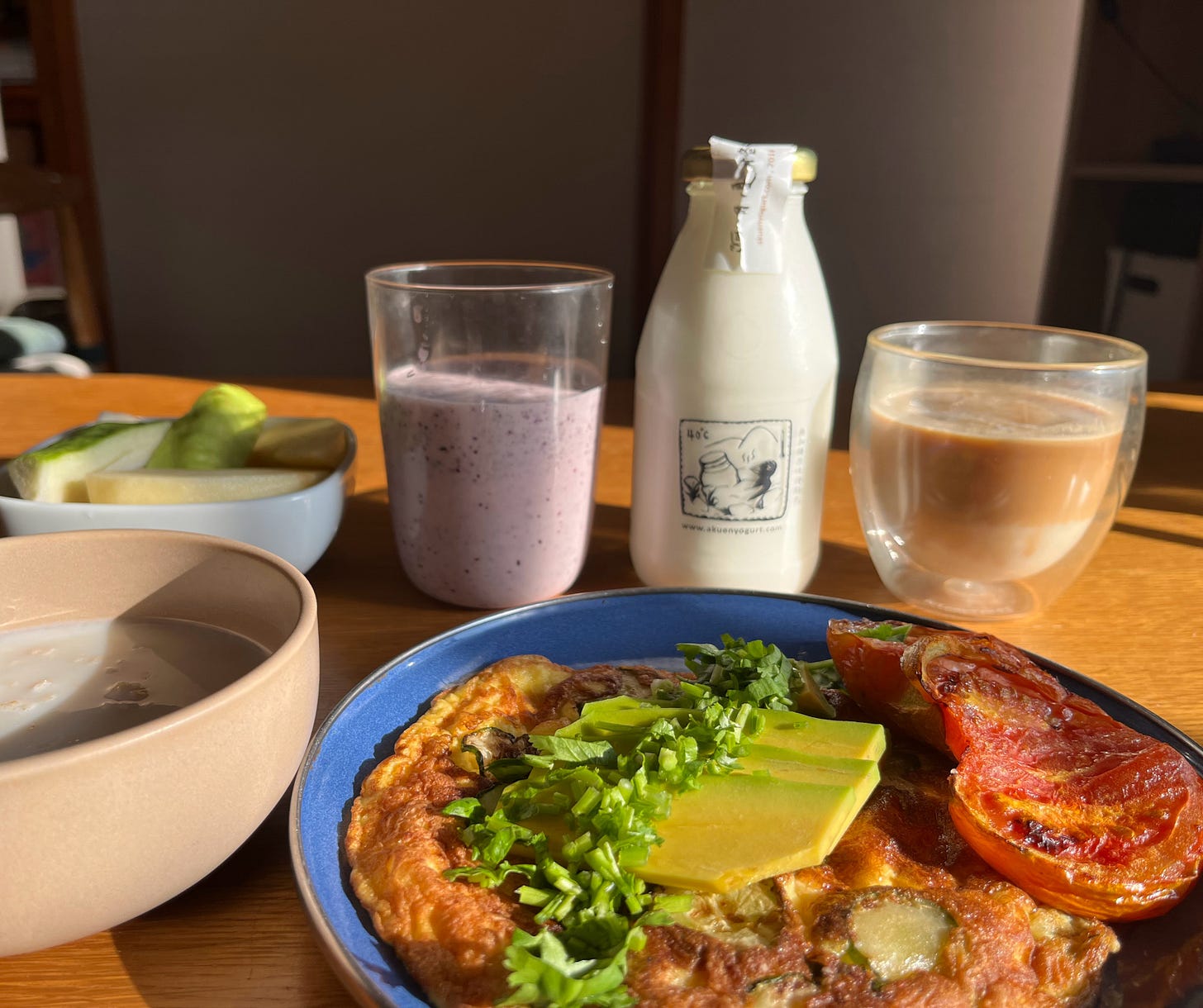 昨天早餐因為是週四上班日,只能迅速處理,用冰箱剩的一小把藍莓,和奇亞籽,一起打優酪乳來喝。自從十年前讀了《天生就會跑》開始,就很迷奇亞籽,吃了覺得自己變超人。最近了解營養學觀點,奇亞籽有很高的omega 3,算是蠻厲害的食物。但即使知道了原理,還是喜歡想像自己是奔馳在洛磯山脈的塔拉烏馬拉人。