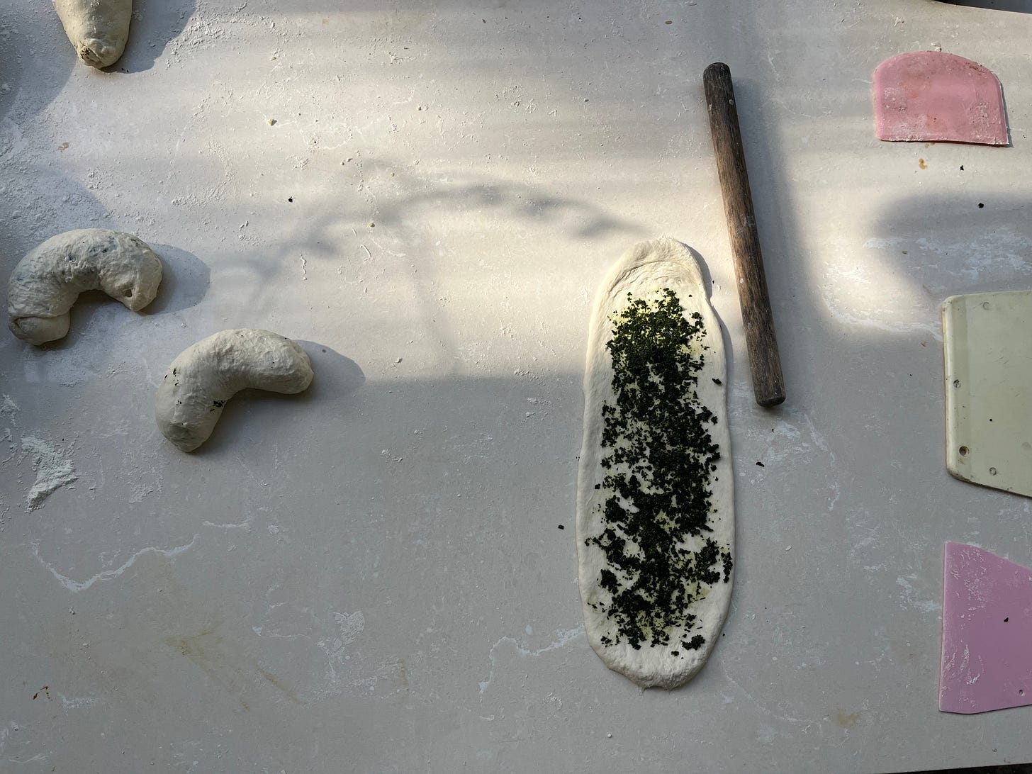 早餐有農場的香椿麵包卷,外殼酥脆,內裡柔軟的香椿醬一層層。一直有點疑惑,農場的香椿醬不是糊糊的綠色,而是看得到碎碎的葉片。這次才知道,他們是手剁的,要剁1000刀。道理雖然不懂,感覺很厲害,剁千刀的香椿醬麵包卷。