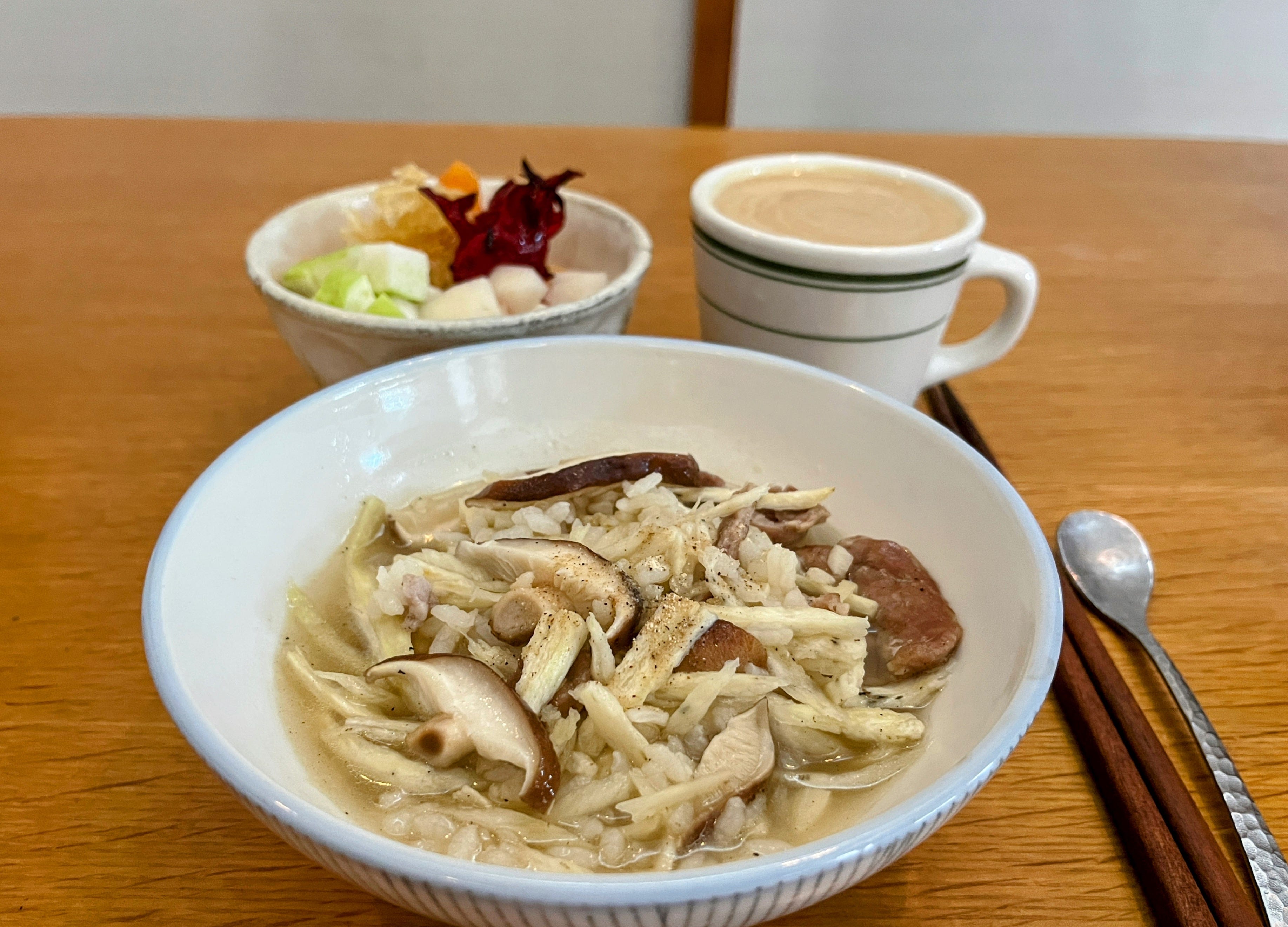 到了早餐吃鹹粥很舒服的季節了。香菇肉粥和茭白筍一起煮,上桌撒點白胡椒,安心的味道。豆漿咖啡裝在雷斯里買的二手小杯,喜歡他厚厚的杯緣。跟柱子哥拿的洛神蜜餞和蜂巢蜜,讓水果優格變很豪華。