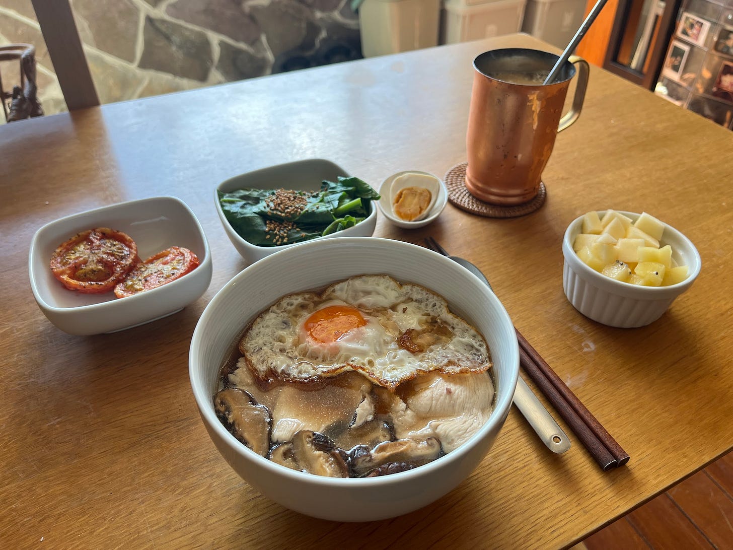剩的黑白糙米煮成香菇雞片粥,配幾個小菜,冰咖啡