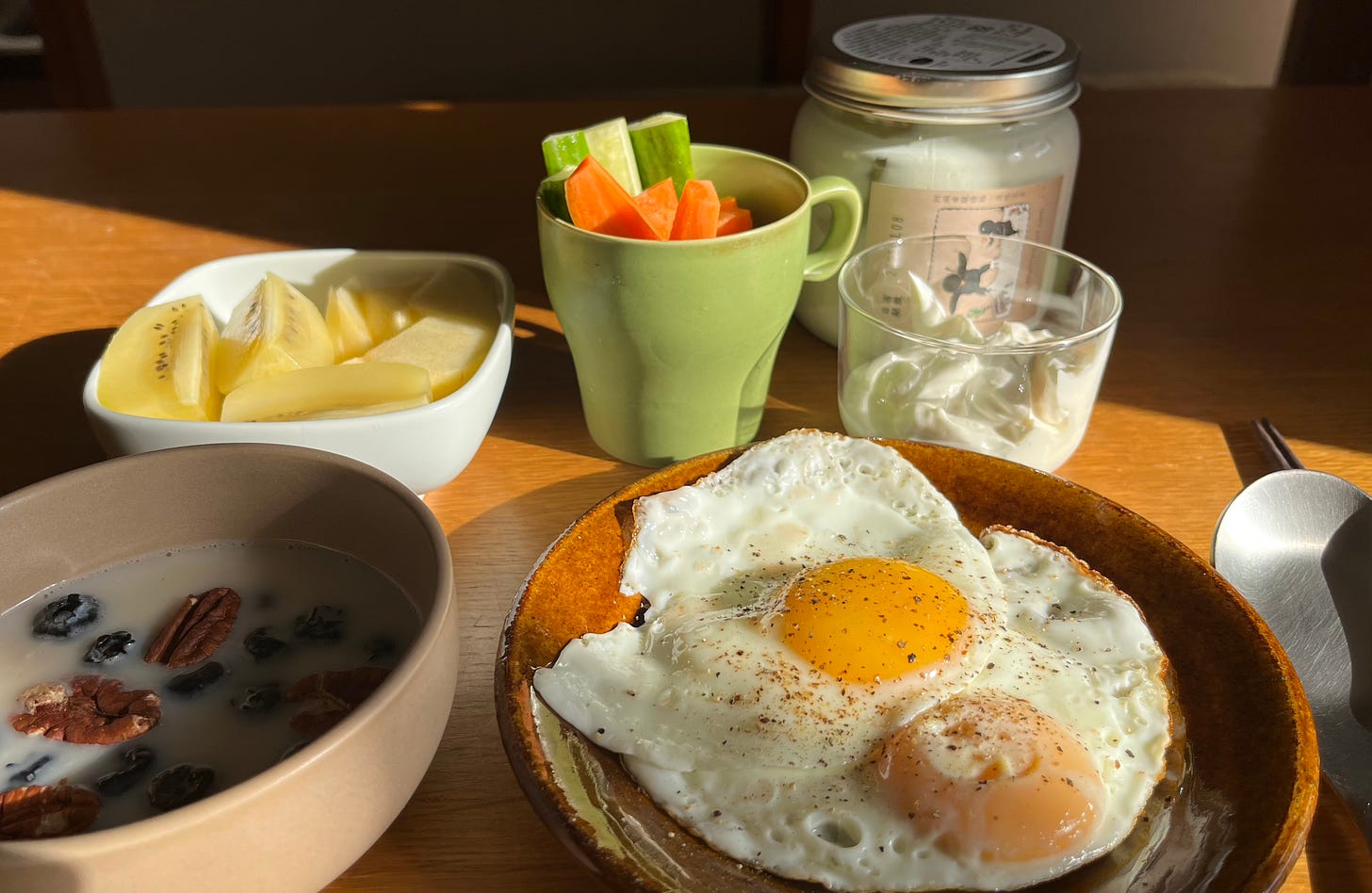 今天早餐是週三優格食譜。想用優格做個沾醬,沾蔬菜條來吃。很多人不喜歡希臘優格,或即使喜歡也沒辦法常常吃,就是因為他的口感很濃稠黏實,直接吃會有點辛苦。但也就是這個特性,讓他可以很好的當沾醬使用。今天只用基本法:希臘優格、蒜、檸檬、橄欖油、鹽。橄欖油可以讓口感變得更滑順,可以試試看找出自己喜歡的比例。冰箱有紅蘿蔔和小黃瓜,切條沾來吃,不知不覺就吃進一大堆蔬菜。沾醬也直接是一份蛋白質,很划算。這個沾醬可以加入喜歡的香草植物或香辛料都會好吃。另外,因為有生的蒜頭,如果當天要約會的話,這個食譜不太適合唷哈哈。
