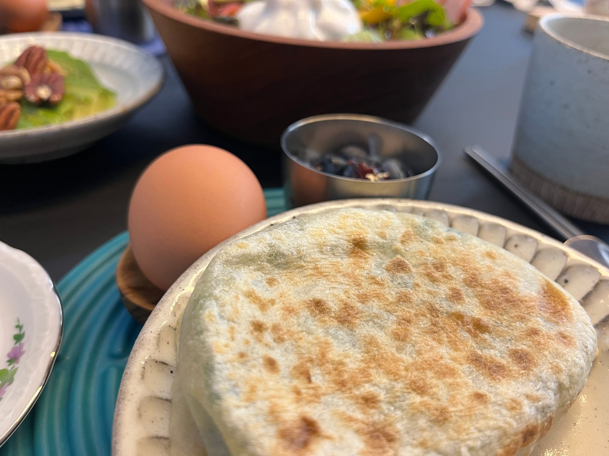 - 有一天早上,和塗塗一起做實驗,在他家做了一大碗沙拉、水煮蛋、和優格。配的碳水是韭菜盒子,乾鍋烙熟,餅皮很香很清爽,咬下韭菜香撲鼻。這餐血糖也是穩穩的。