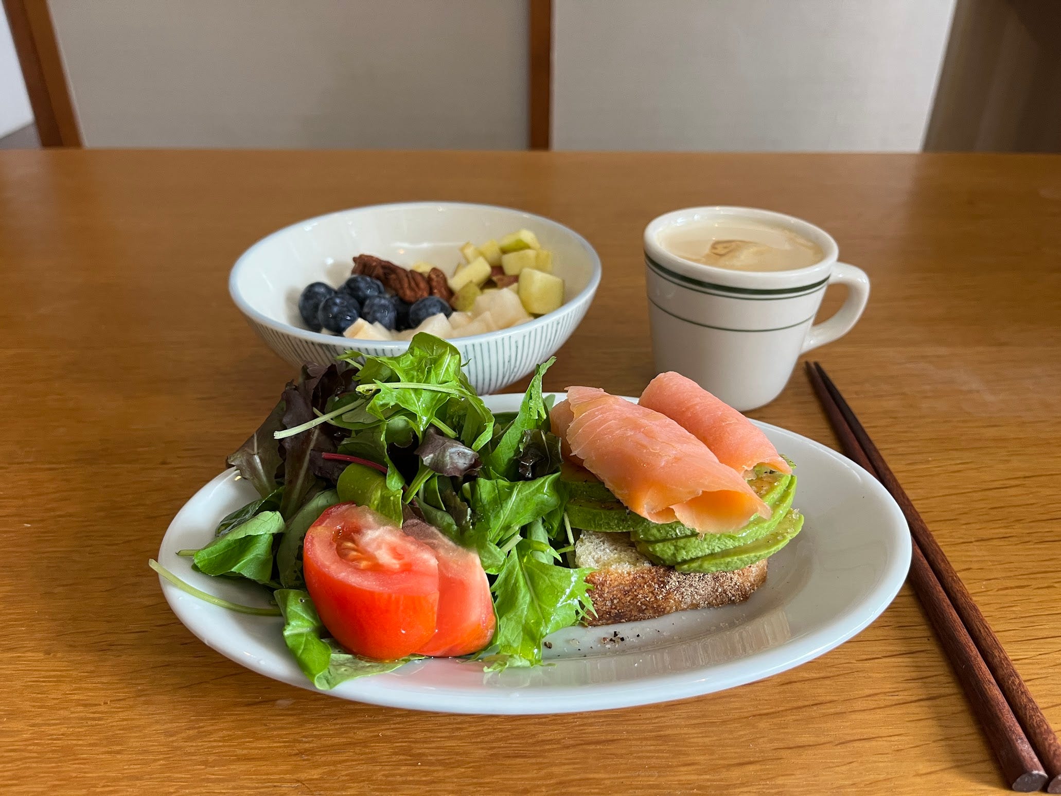 自製酸種烤過,酪梨薄片磨上鹽和胡椒,放上燻鮭魚。懶得再用檸檬或酸豆,就這樣上桌了。麵包、酪梨、燻鮭魚,呈現豐厚的、肉肉的口感。很喜歡。